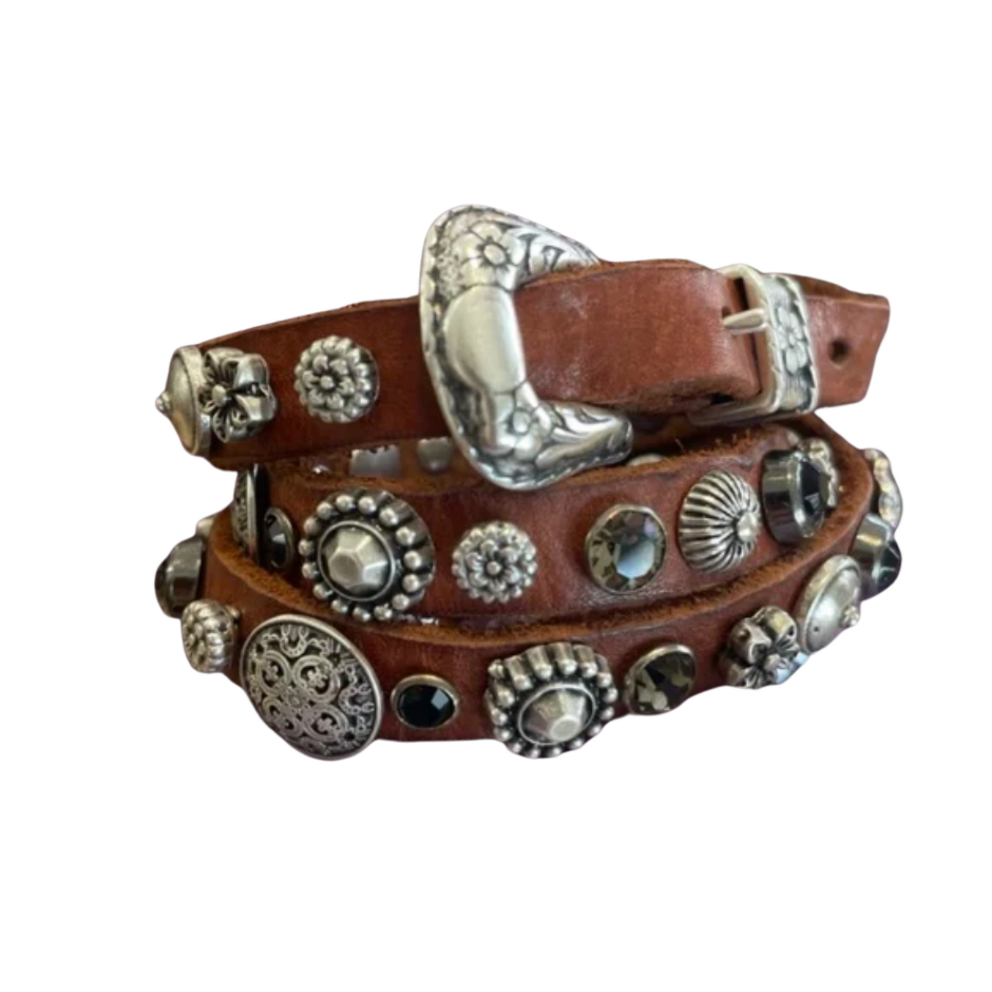 Brown leather, silver toned studs, medallions, and flowers, black and clear rhinestones, worn wrapped two or three times around the wrist, secures with an adjustable buckle
