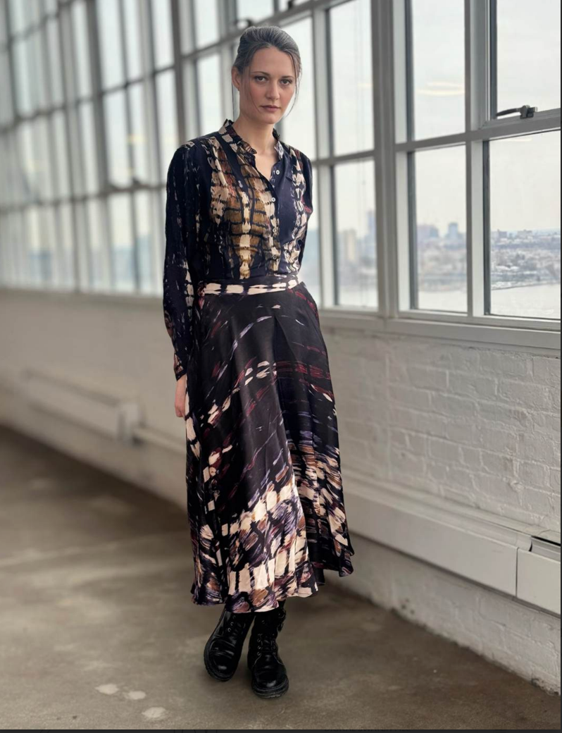 White and yellow and pink tie dye on a purple background, ruffles around the collar