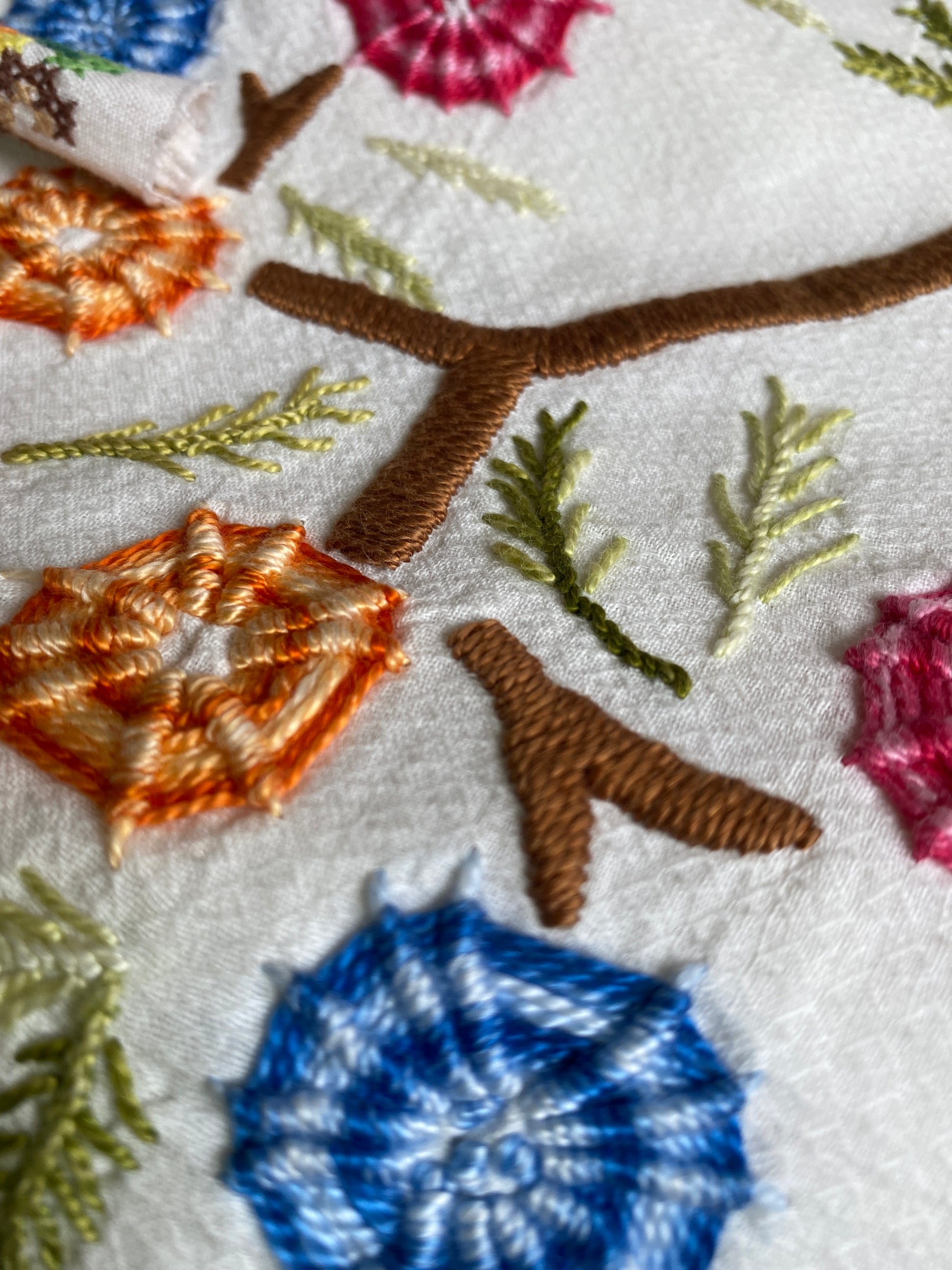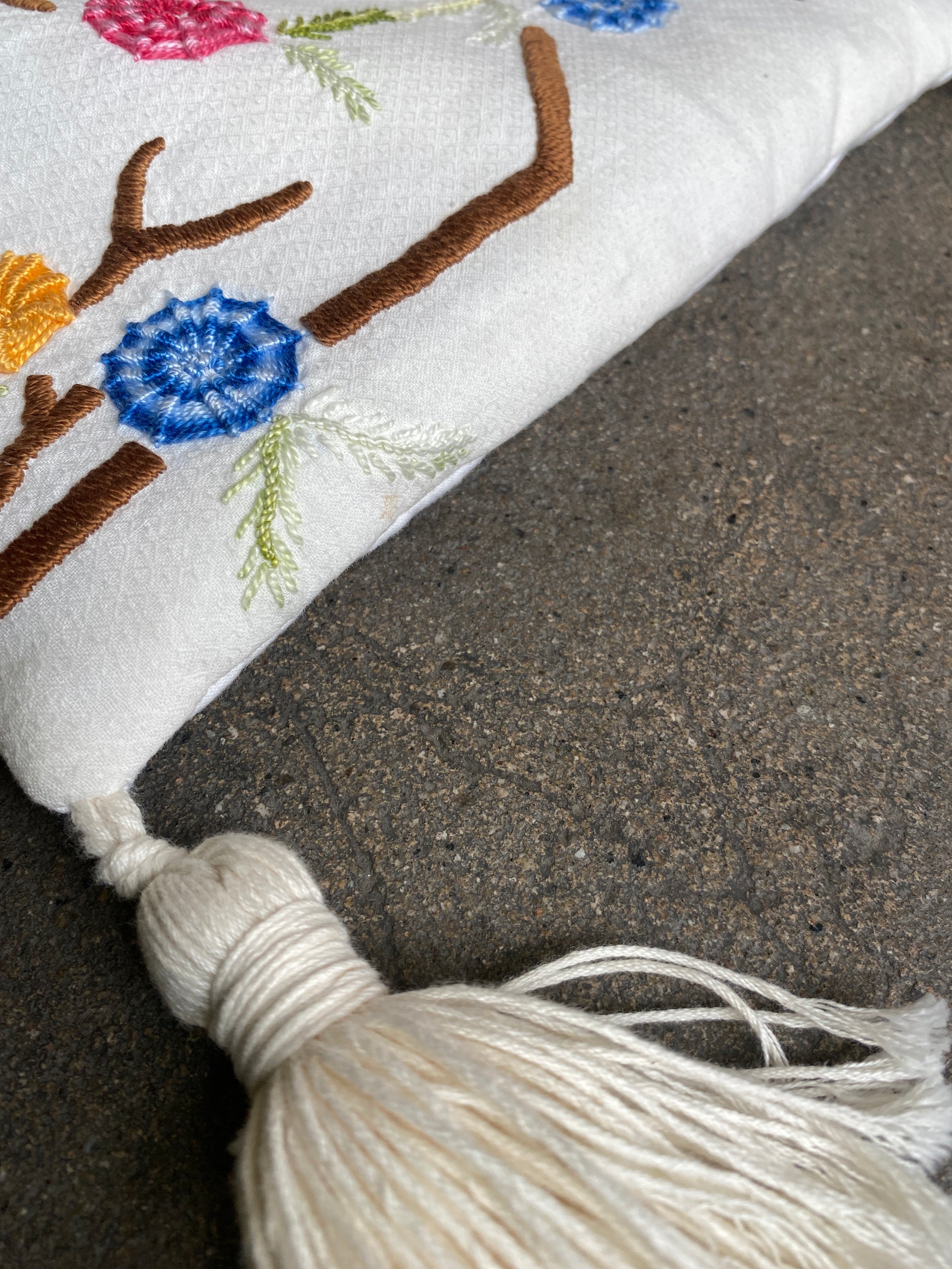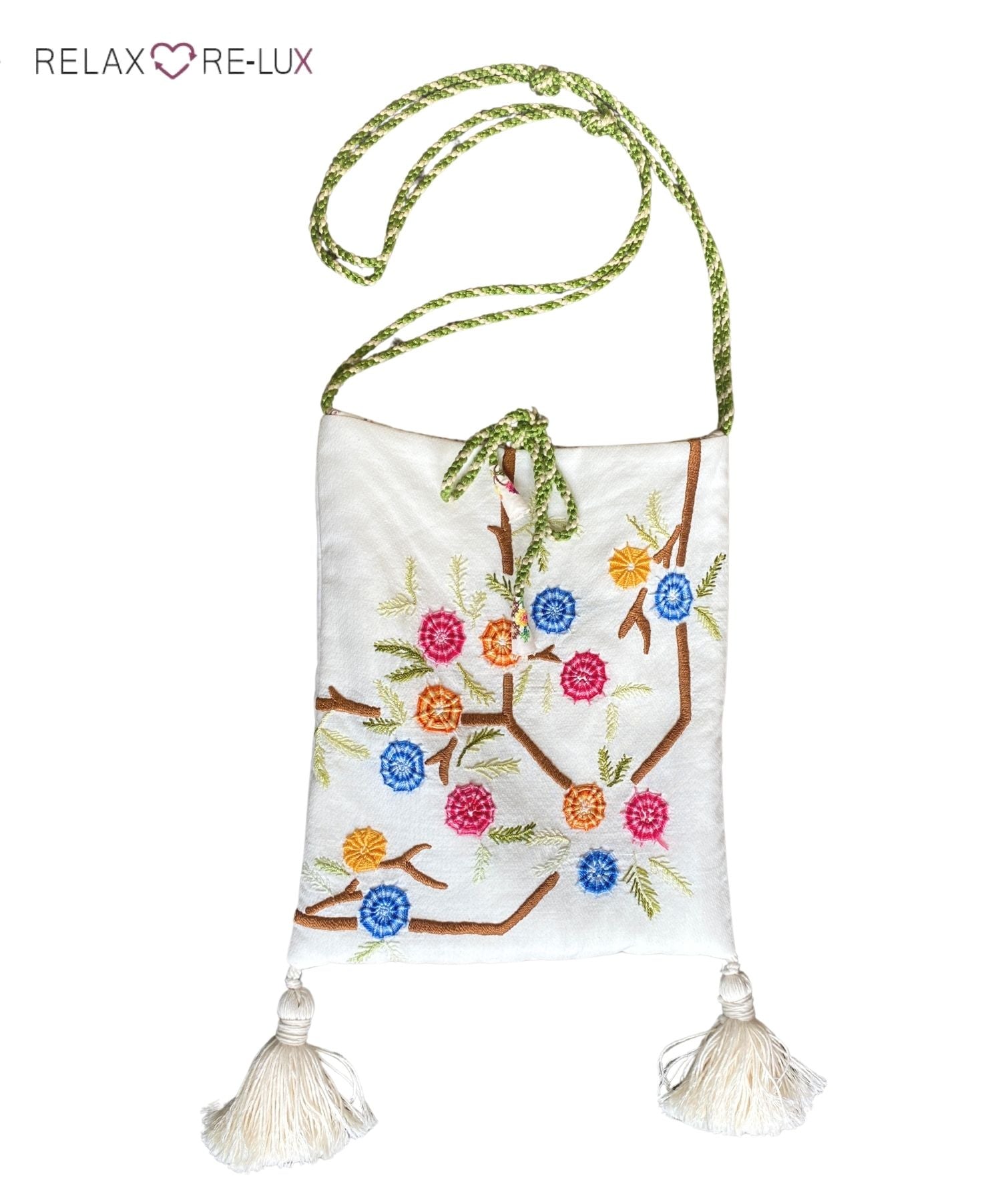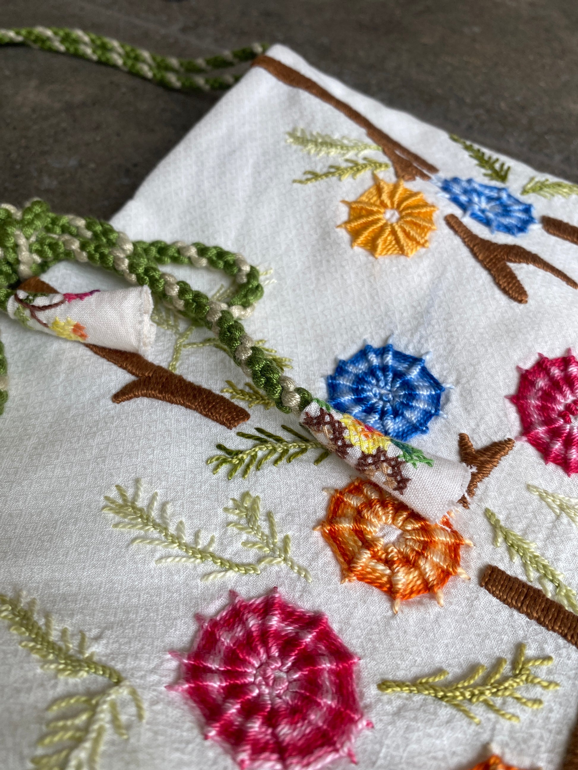 Fresh upcycled cotton bag made with vintage embroidered household textiles featuring an adjustable tie-up closure.