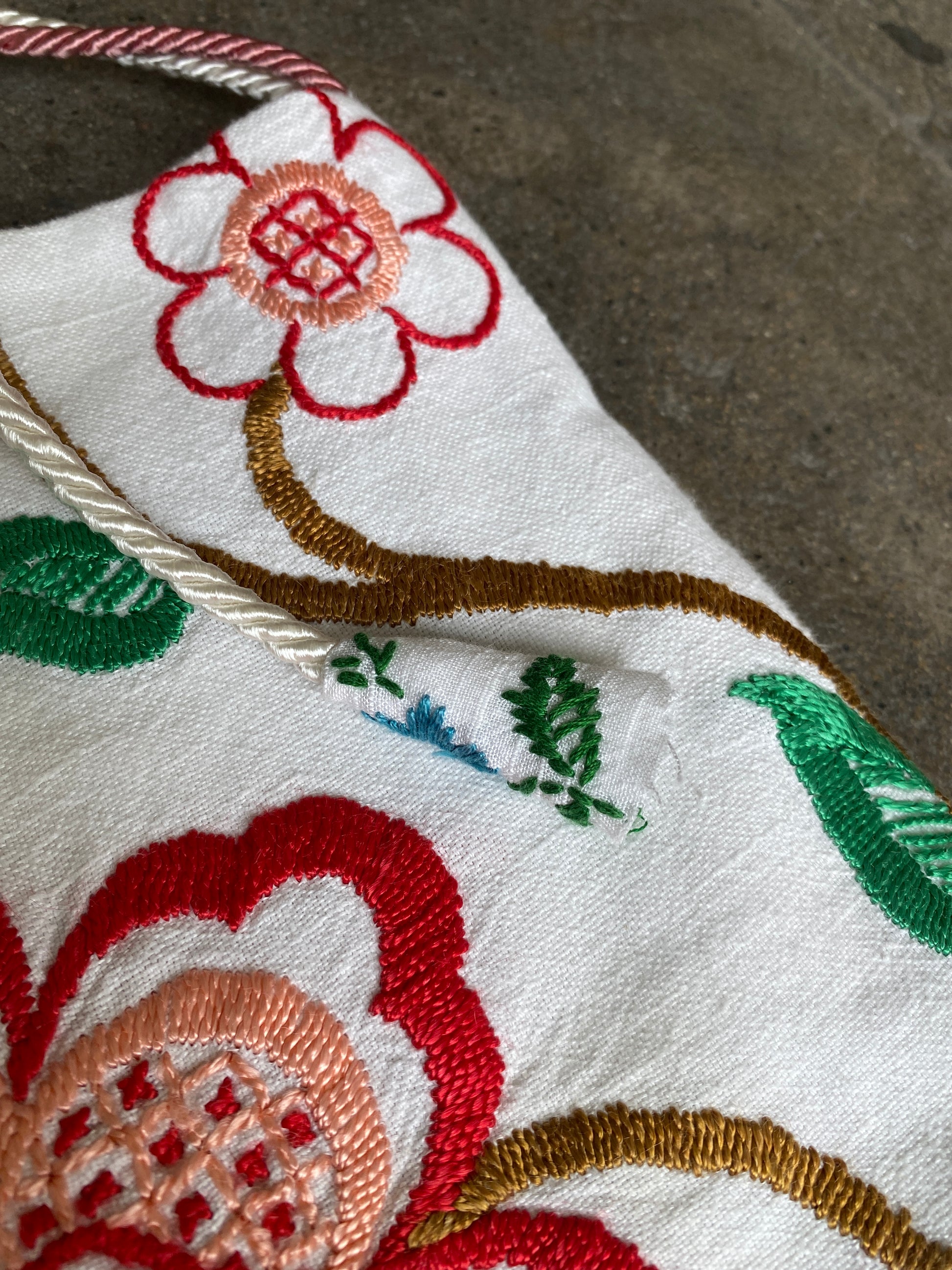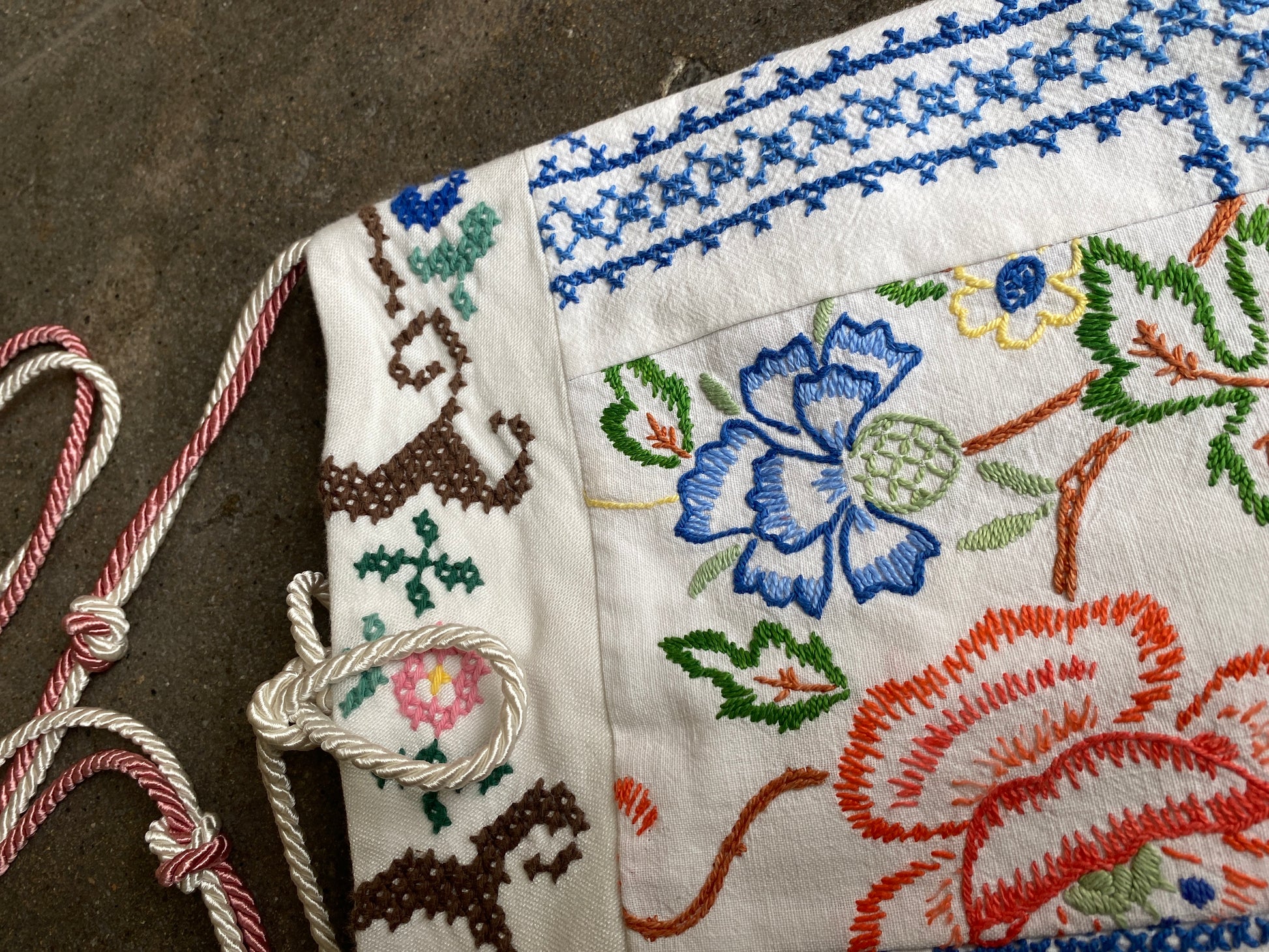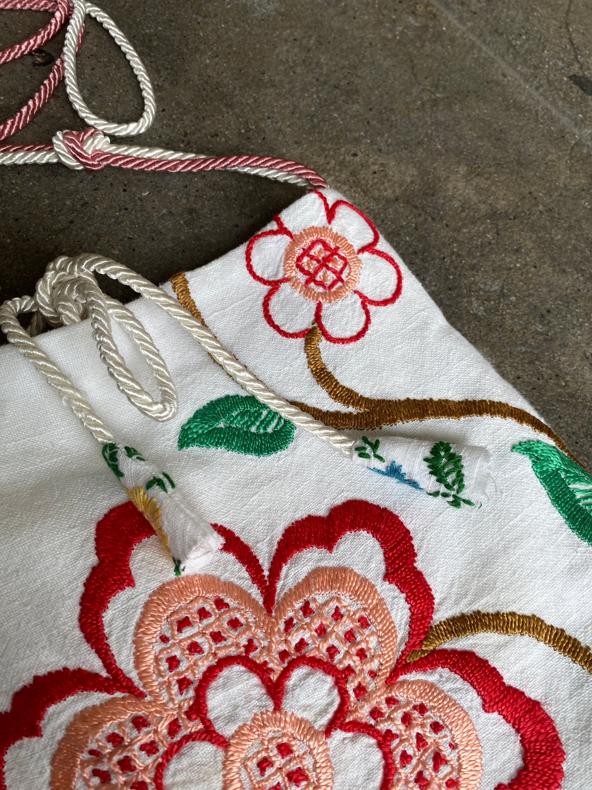 Fresh upcycled cotton bucket bag made with vintage embroidered household textiles featuring a single top handle/shoulder strap.