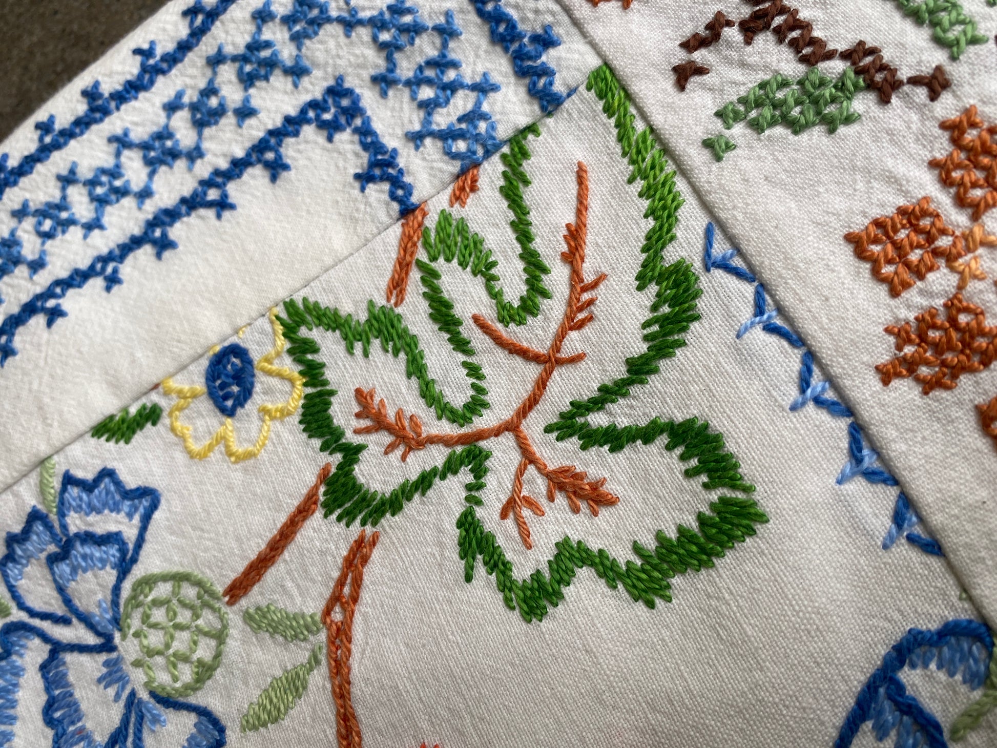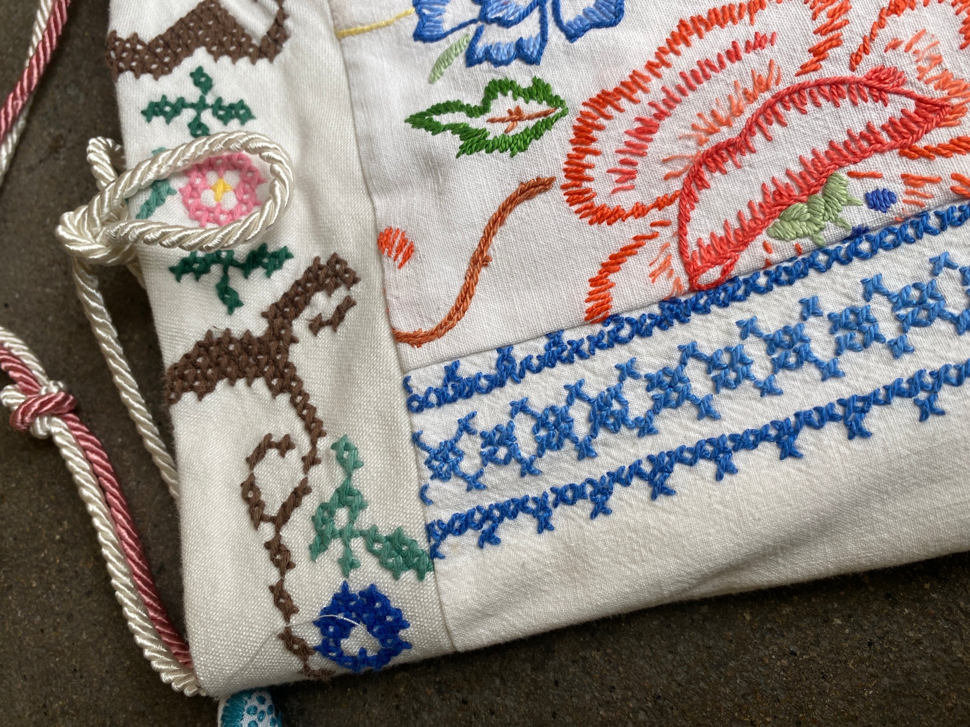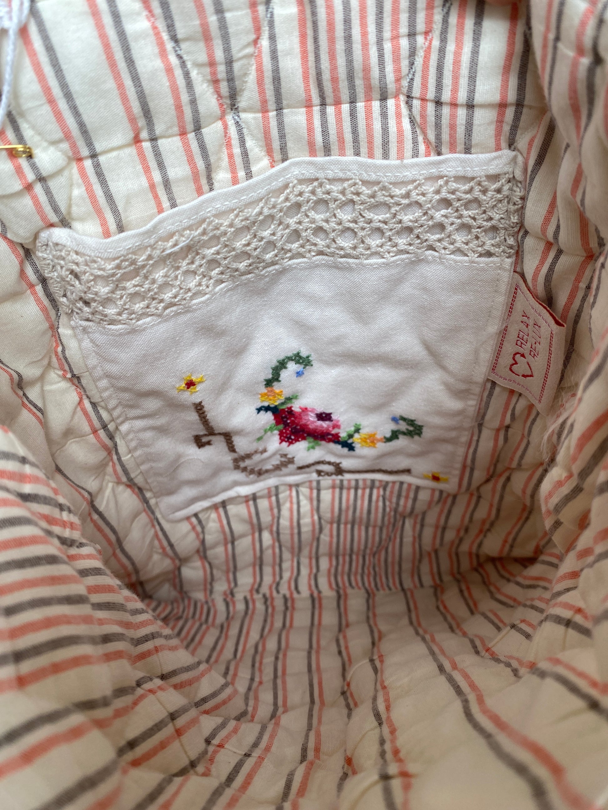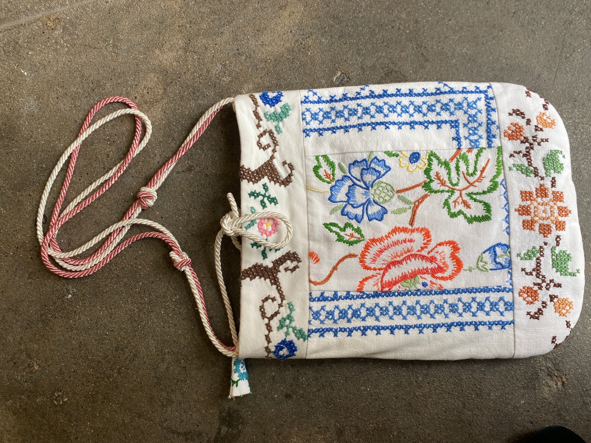 Fresh upcycled cotton bucket bag made with vintage embroidered household textiles featuring a single top handle/shoulder strap.