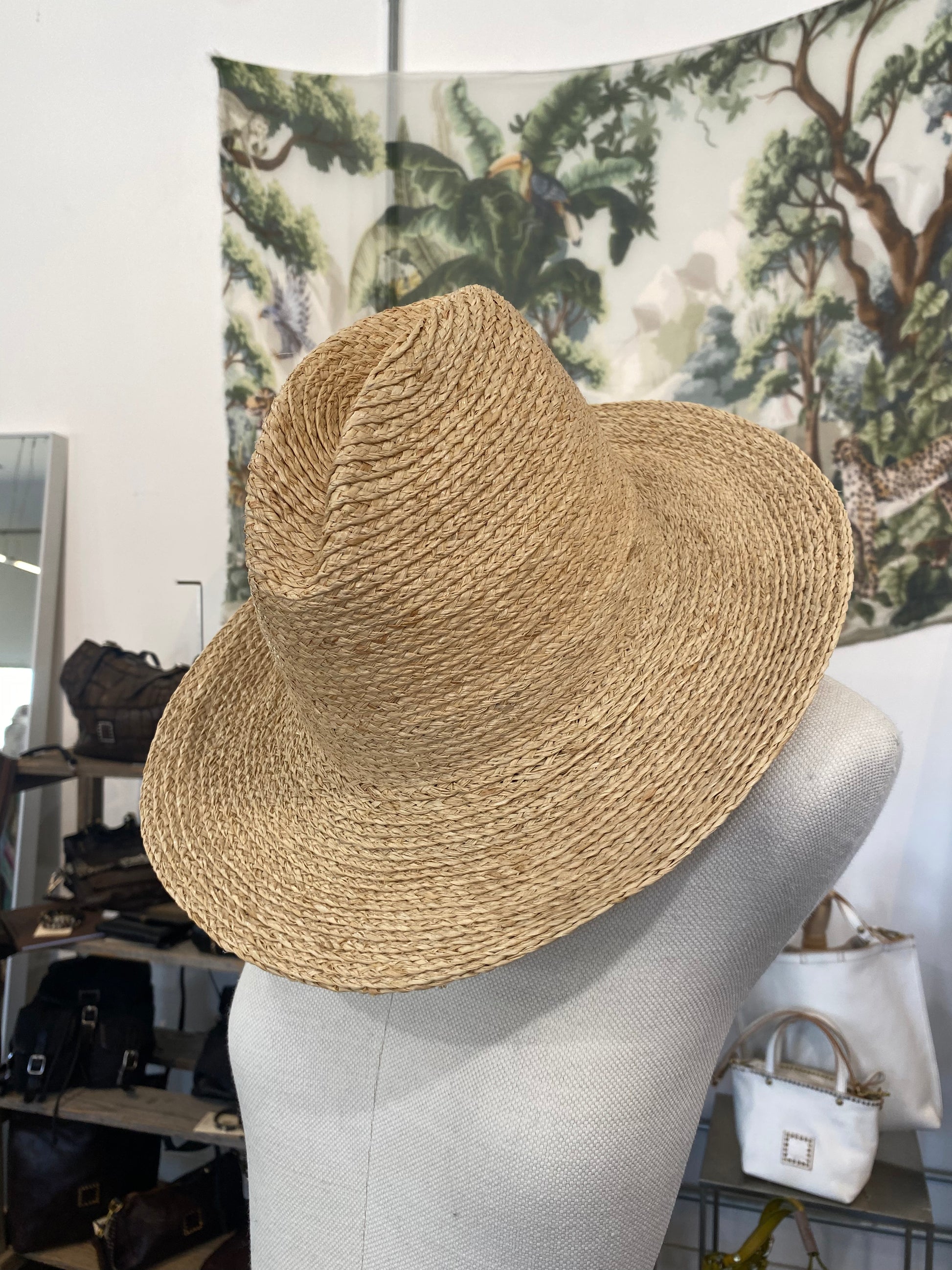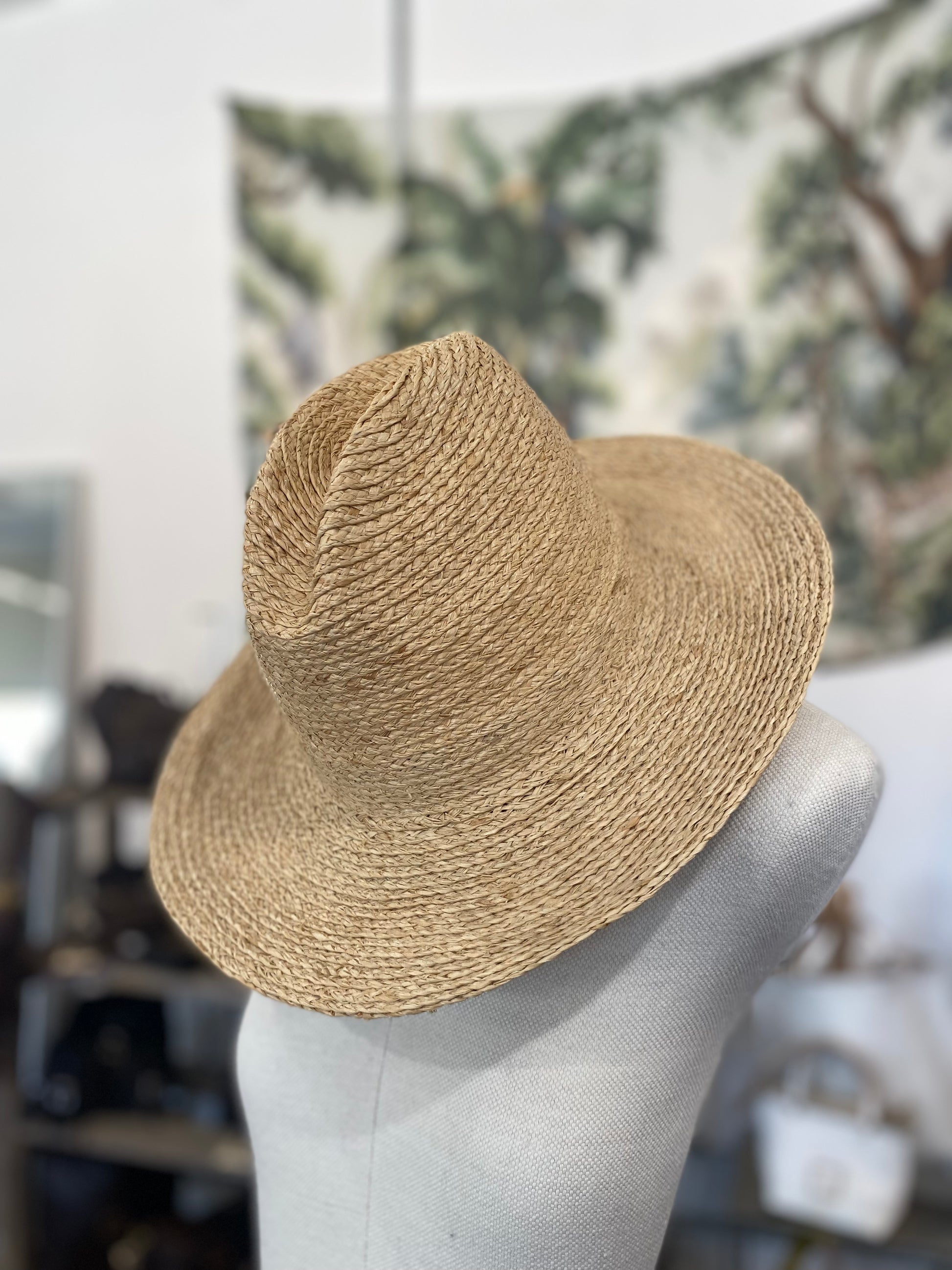 Medium-brimmed hat with handsewn straw directly on hat form.